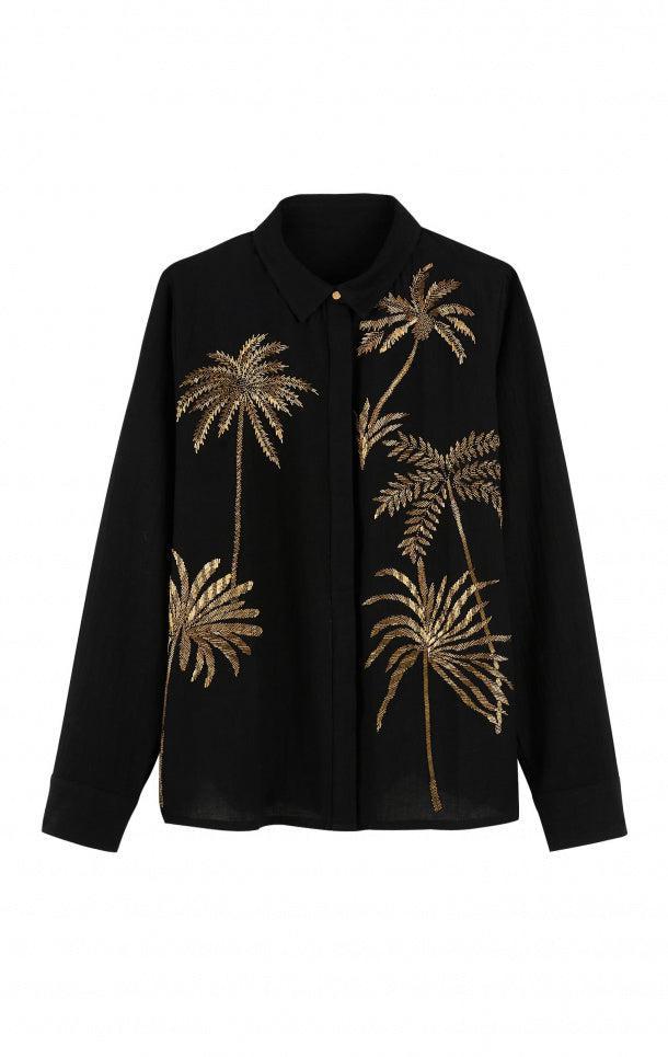 Angelo est une chemise en gaze de coton entièrement rebrodée, sur le devant, de perles dorées et gun aux motifs de palmiers exceptionnels. Sa coupe cintrée est droite avec des manches montées assez près du corps. La patte de boutonnage dévoile d’adorables petits boutons dorés. On adore cette pièce géniale qui annonce un été exubérant. La blouse Angelo se décline en quatre couleurs : blanche, rose, bleue et noire.